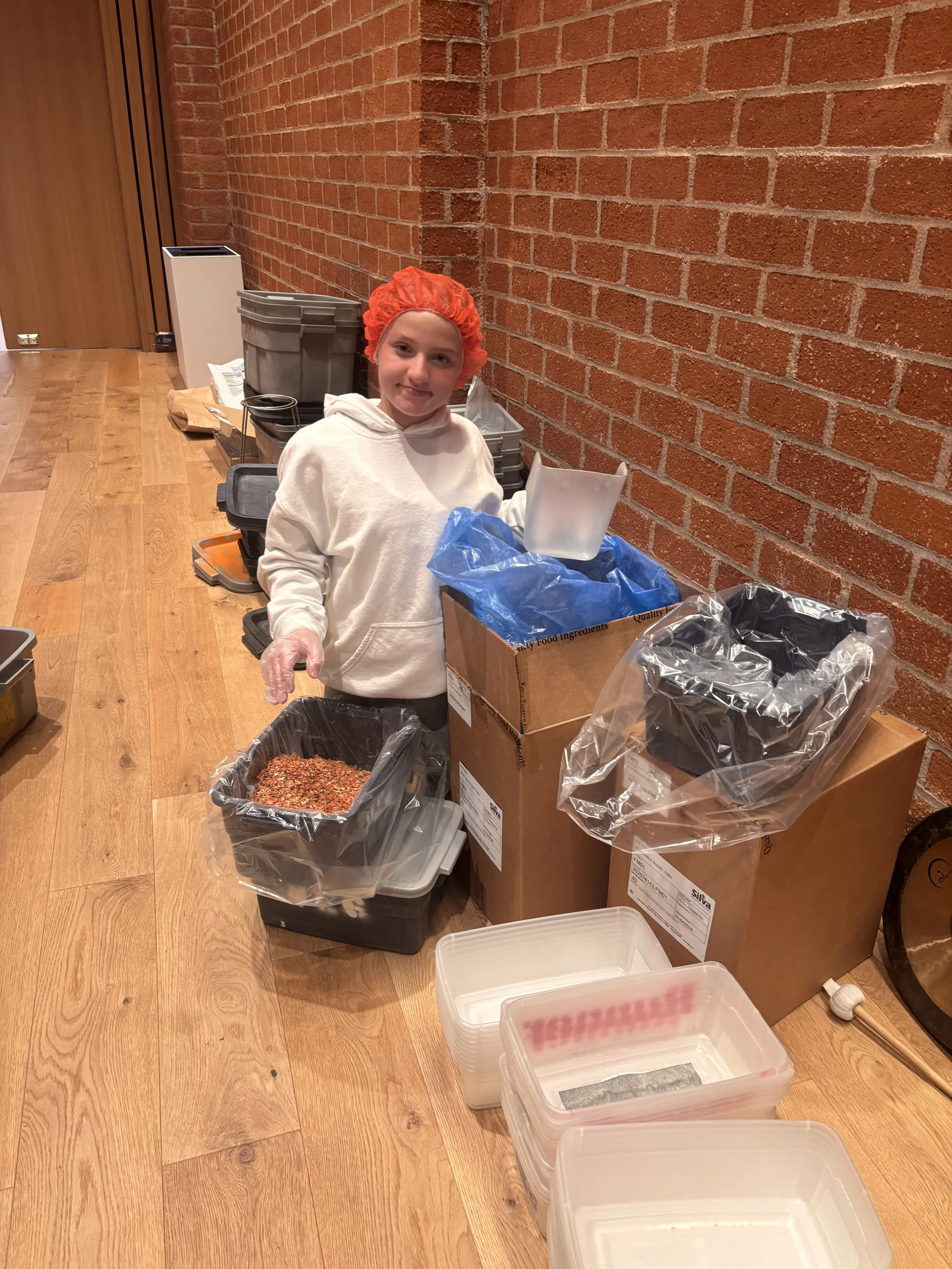 An amazing volunteer opportunity to make meals for people is at OBKLA! The age requirement is 5 and up. Each Sunday session is two hours. Once you arrive, if you have long hair you have to wear a hairnet and all volunteers must wear aprons and gloves at most times. We started off by shaping meatballs and putting them on trays to be cooked. We then made snickerdoodle balls onto trays to be baked, put labels on the cookie bags, and then we took a quick break! After the break we watched a video about OBKLA and packaged the meals. The proceeds go to many people in need of food. As we were leaving, they gave us cookies to hand out to people we saw in need. In total, we made 600 meals! OBKLA is an amazing experience.